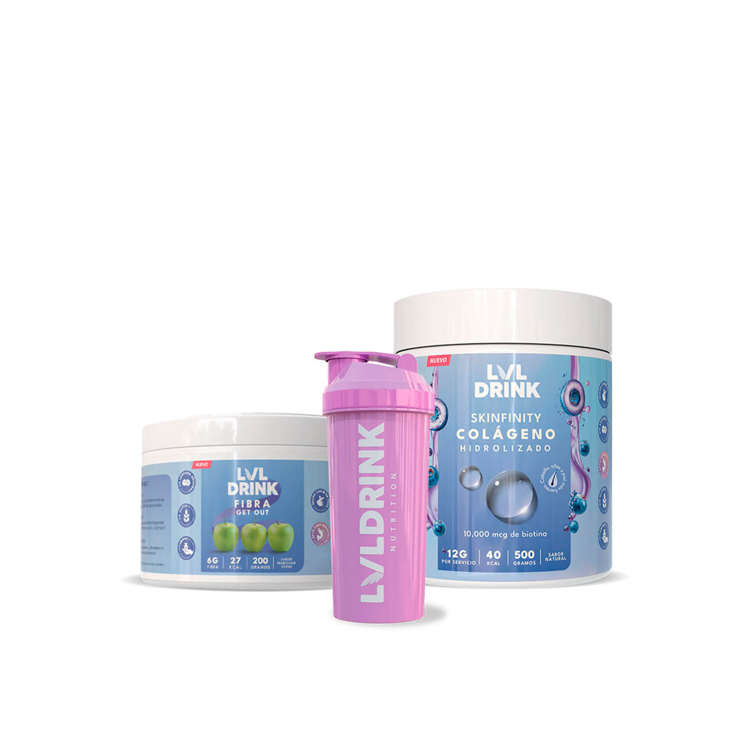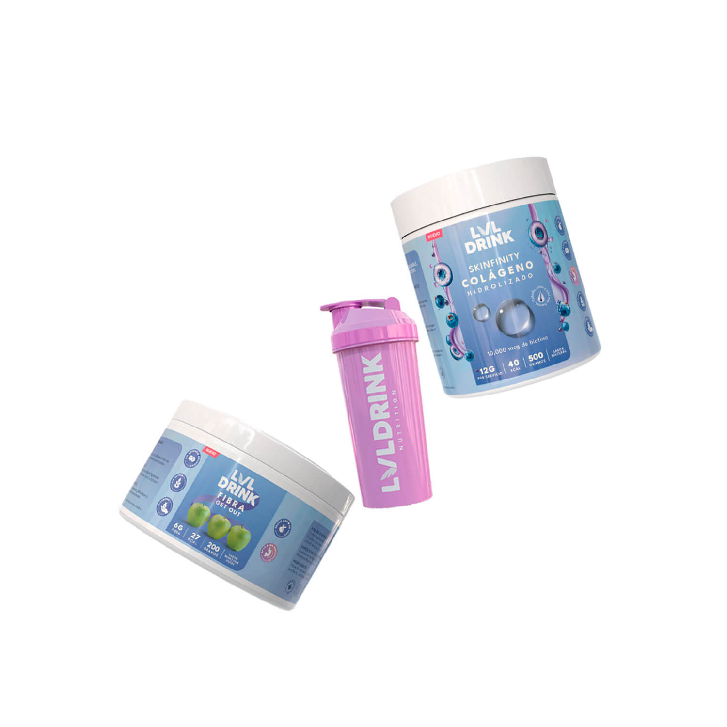 El Pack Colágeno + Fibra Lvldrink incluye colágeno hidrolizado 500 g, fibra natural de manzana verde 200 g y un shaker de regalo, ideal para complementar tu rutina diaria de manera práctica y saludable.