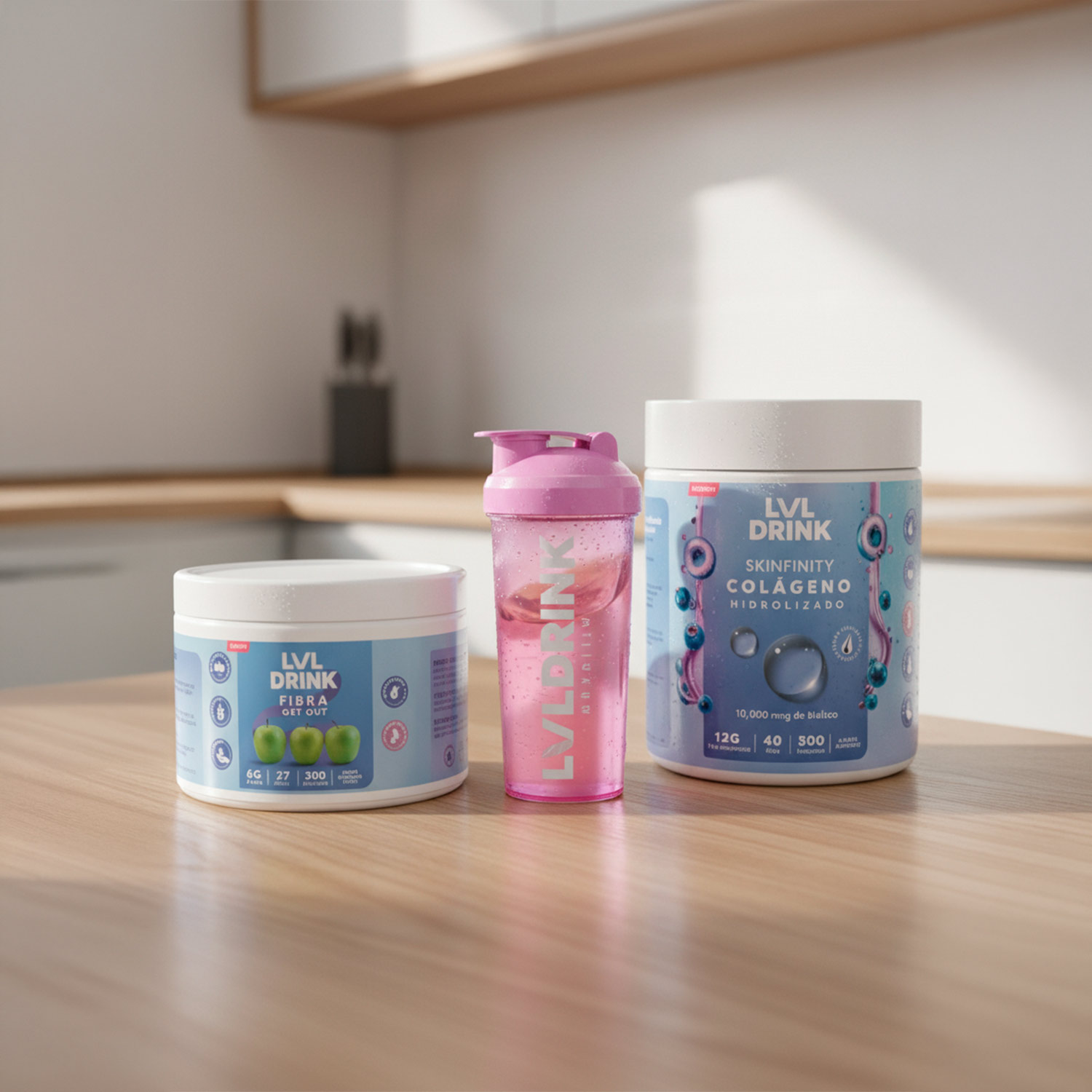 Con el Pack Colágeno + Fibra Lvldrink, incorpora colágeno y fibra a tu día a día de forma práctica y sencilla.